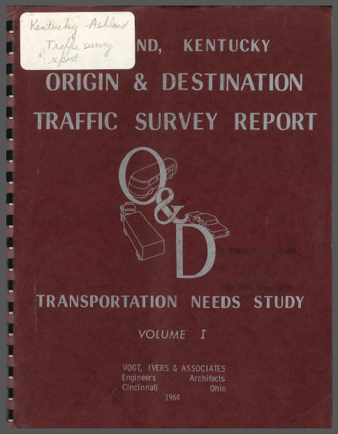 Ashland, Kentucky origin & destination traffic survey report : transportation needs study / undertaken by Vogt, Ivers & Associates. (OCLC #82928188)