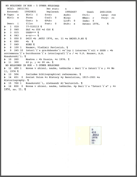 This printout stuck in a nearly-cataloged book is from around 2003, so is probably from OCLC Passport? The call number label is no longer sticky, which is fine, because it is not the one we’d choose for this volume. Maybe that was the problem.