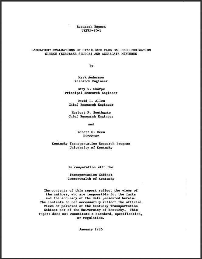 Laboratory evaluations of stabilized flue gas desulfurization sludge (scrubber sludge) and aggregate mixtures / by Mark Anderson, Gary W. Sharpe, David L. Allen, Herbert F. Southgate and Robert C. Deen. (OCLC #884361903)
