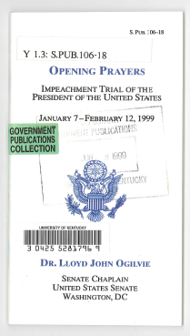 Opening prayers : impeachment trial of the president of the United States, January 7-February 12, 1999 / Lloyd John Ogilvie ; [prepared under the direction of Gary Sisco]. (OCLC #41594951)