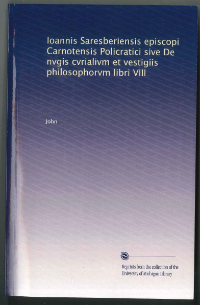 Ioannis Saresberiensis episcopi Carnotensis Policratici sive De nugis curialium et vestigiis philosophorum libri VIII / recognovit et prolegomenis, apparatu critico, commentario, indicibus instruxit Clemens C.I. Webb. (OCLC #965502804)